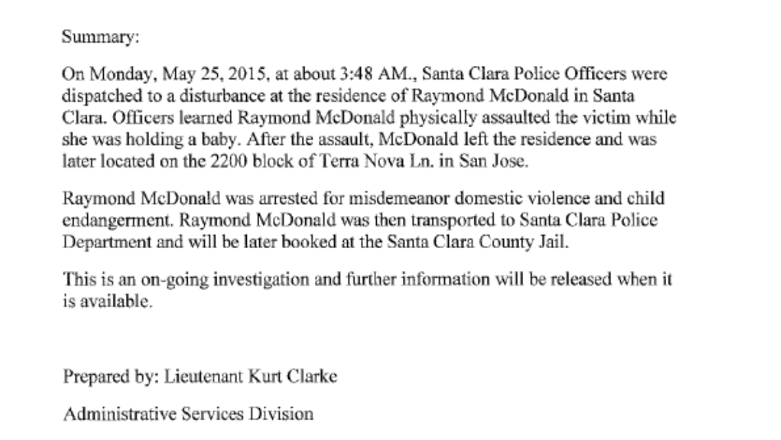 #BREAKINGNEWS: per Ray McDonald arrest report: Santa Clara PD arrest report officers responded to a disturbance at 3:48am, #Bears Ray McDonald arrested for misdemeanor Domestic Violence and child endangerment for physically assaulting the victim while she was holding a baby. After the assault, McDonald left the residence and was located at the home of former 49ers teammate Justin Smith. He has not yet been booked and remains at Santa Clara County Jail per Lt. Kurt Clarke