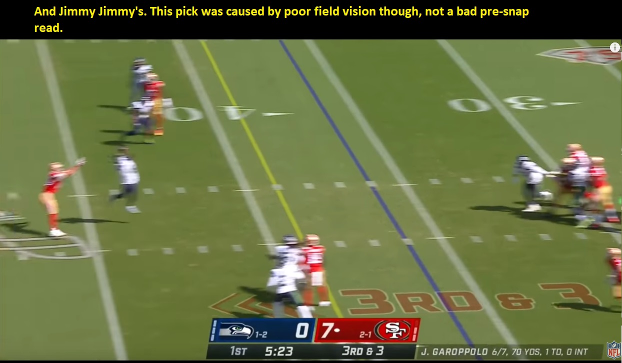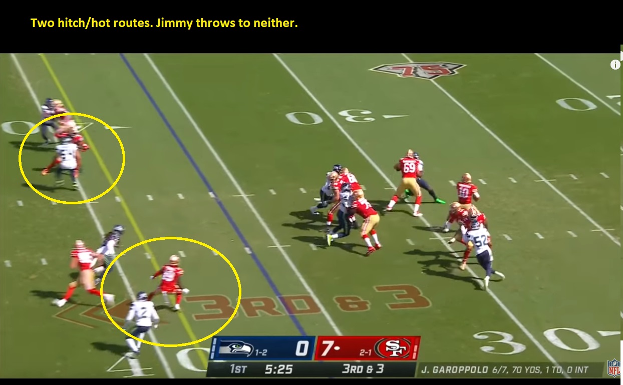 Okay, I'll go back to the Seahawks 49ers game, where Seattle ran the look and Jimmy DIDN'T throw it fast (still got intercepted though...).
