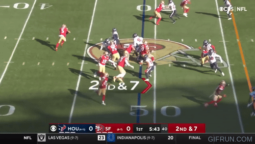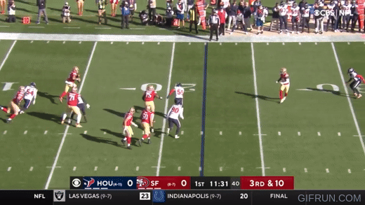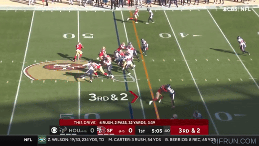 Here we have a situation where he's watching the guy closest to him, but lacks the vision to see the guy behind him with the angle. Here he is thinking he can beat the guy in front of him with a sudden acceleration, and push through his tackle. But he doesn't account for the guy behind the man in front of him. Because of inexperience and inadequate vision as a runner. What he SHOULD have done is immediately sprint as fast as he can towards sideline and the marker, using speed rather than guile to get by the guy in front of him, because he would NEVER be able to get by both by juking the first guy enough to break through his tackle. He doesn't take into account the second defender until it's way too late to have any hope. Either that, or he thought he'd be able to power through both, which is just as bad (EDIT: no, he's not beating DBs to the sideline, but he has a better chance if he just goes for the straight line towards the pylon; also notice two 49ers not blocking anyone. That's not all on Trey here).