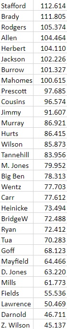 In fact, that's the biggest issue with this metric, is that team contribution leaks in. You can see that by the Stafford 2020 comparison. In one season in this metric he went from just under Jimmy to just under Brady in 2021 (it should be noted that Stafford's 2020 rating still indicates a winning QB, given that the QBs around that number had winning records, so he was still playing winning football, but just on a terrible team). The degree to which a good team helps a QB, by the way, goes beyond simple passing stats. For example, QB on a good team doesn't have to take as many chances.