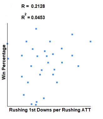 Maybe I'll do something like yards per attempt, but make on target passes the attempts. "Completed Air Yards Per On Target Pass." However, this isn't good enough, because (1) it could just mean that WHEN someone is on target, they get lots of yards, and (2) it has a weak correlation with winning (which makes sense given (1)). But, perhaps what I can do is multiply that number by first downs per pass attempt. The units would be weird: [Y][1ST]/([ATT][PASS PLAY]). But, I can fix that by using first downs per pass rather than first downs per pass attempt (which makes sense, because I'm already taking sacks into account directly). So it would be (Completed Air Yards per On Target Pass) * (First Downs per Pass Attempt). This actually correlates about as much as CAY, so it's small, but not weak.