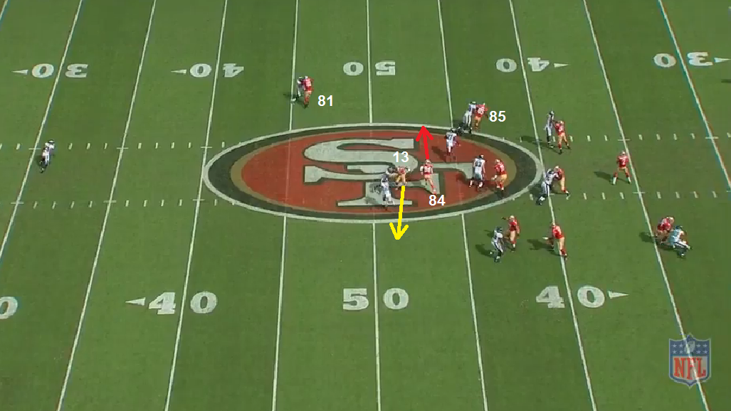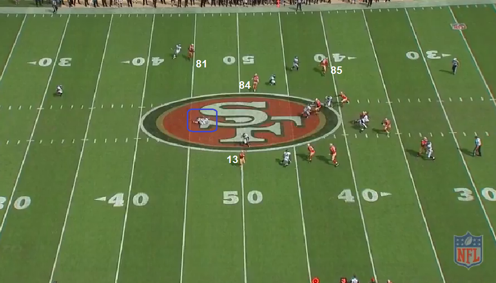 The slot corner does a good job of staying in a "trail technique" against Boldin as he knows he's got help to the inside with the LB. Loyd does a good job of creating separation at the bottom.