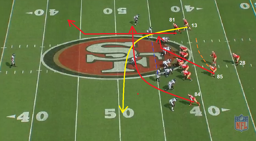 Philly is going to run a cover 1 "lurk" with the MLB playing a "lurking" middle zone. We're going to run an in/out pattern up top and a double slant on the bottom.