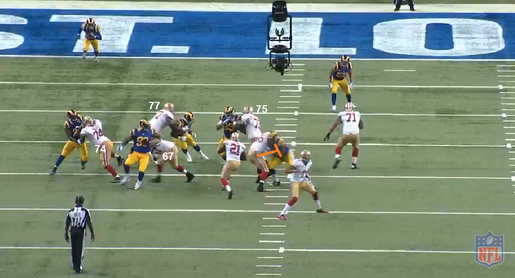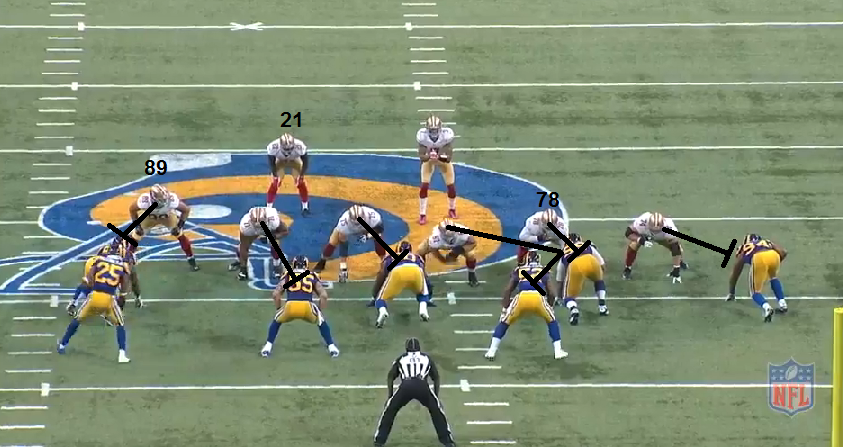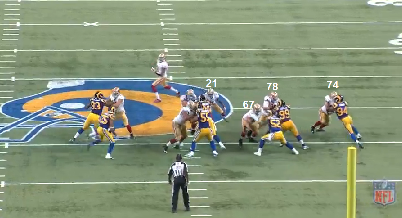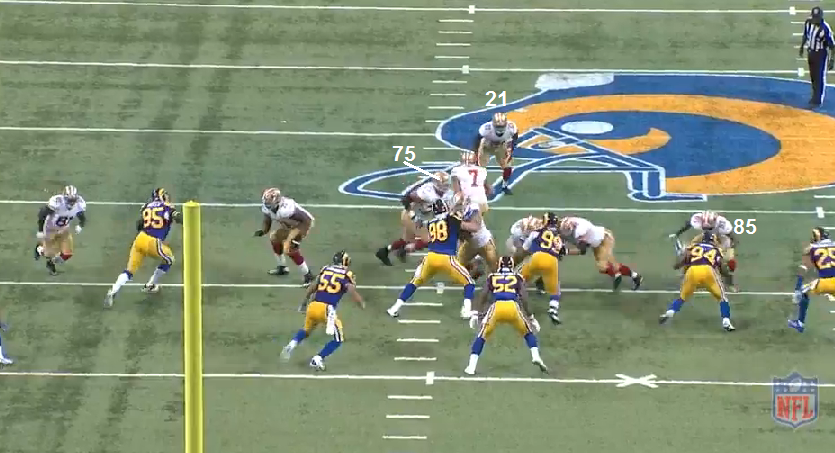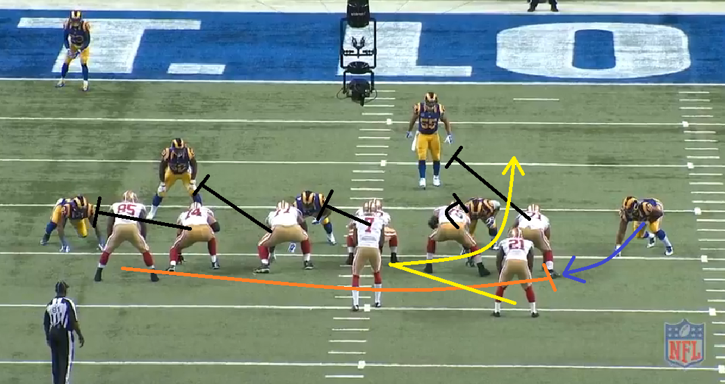 We're gonna run a fake handoff to Hyde to the right. Alex Boone is gonna pull a "circle" block. He'll step back for half a second and then take off as a lead blocker for CK. Looney is gonna pull out as well and try and seal the edge.