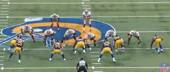 We're gonna run a fake handoff to Hyde to the right. Alex Boone is gonna pull a "circle" block. He'll step back for half a second and then take off as a lead blocker for CK. Looney is gonna pull out as well and try and seal the edge.