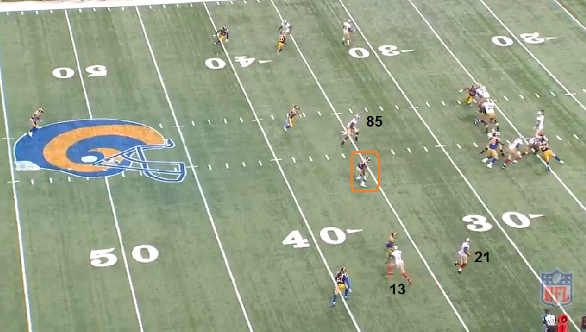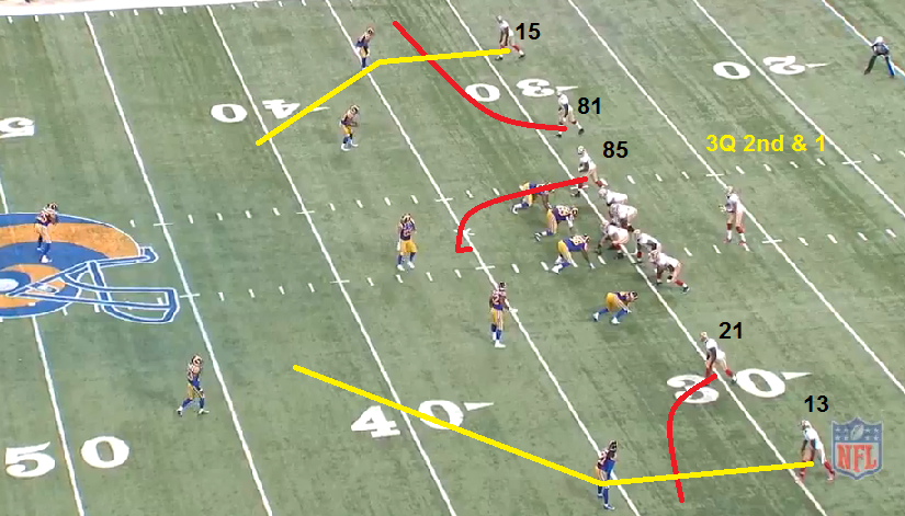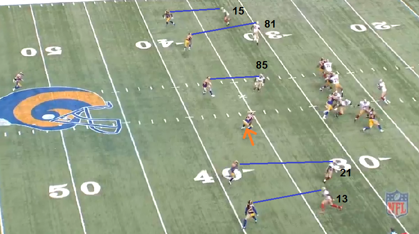 So, what we'll generally have is, instead of a "hot route" we'll have a "hot receiver". The difference is, instead of the a route changing, there's usually one receiver that's a designated, "hot" receiver on the play. That's the route that the QB has to be alert as the route he's to throw to in case of an unexpected blitz. The receiver himself has to understand that too and turn and look for the ball sooner. Sometimes, when they're all deep routes, it's to go to the outside receiver on a deep ball - like in the S. Johnson play I showed earlier. The play was almost there for a big gain. Sometimes, with mobile QB's, it's the QB's legs that are the hot checkdown. Depends on the particular play and unfortunately, without the playbook or being in the meetings, we can't know for certain on some given plays.