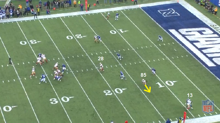 As the play develops, you see how the LB is going to be a tough spot on VD, he has to be aware the the threat from an out breaking route from the RB, but is in a losing situation with inside leverage on VD. Johnson's route will clear out the outside defender as well.