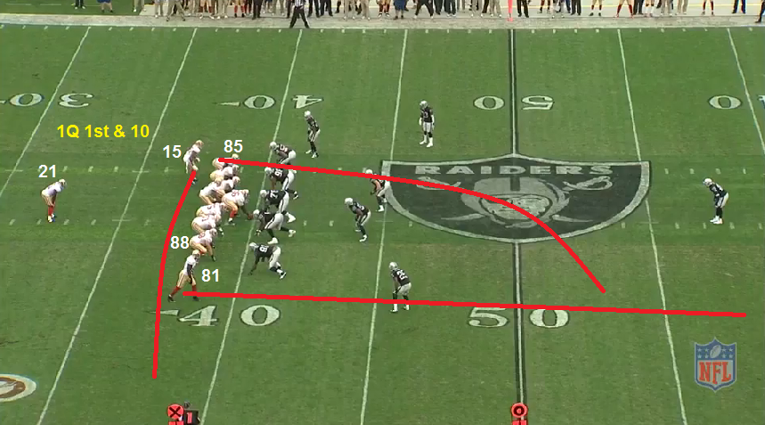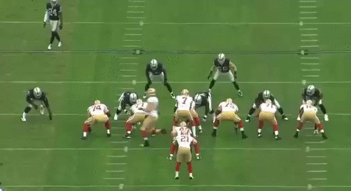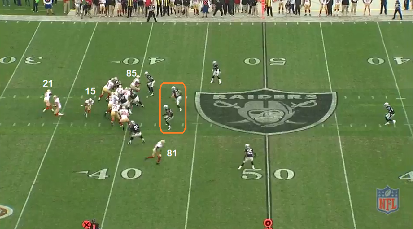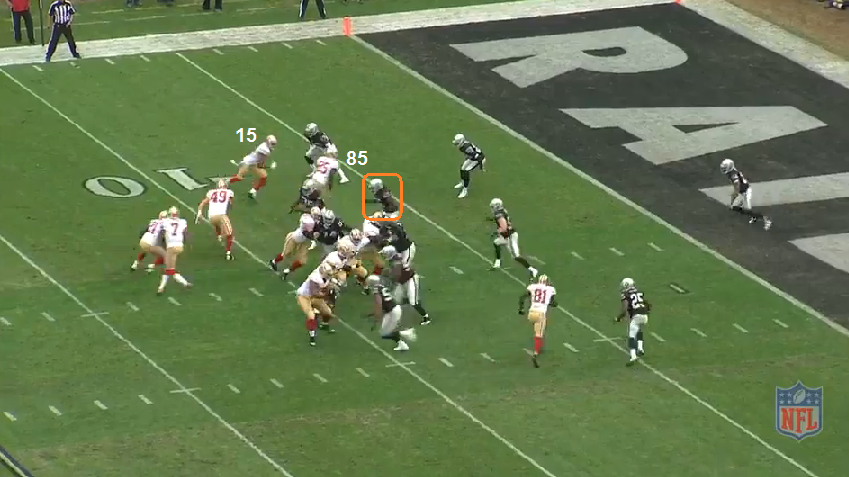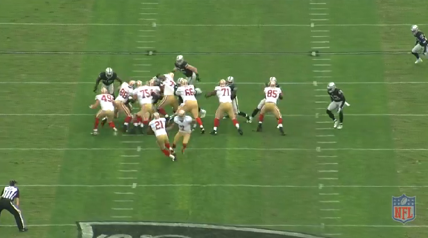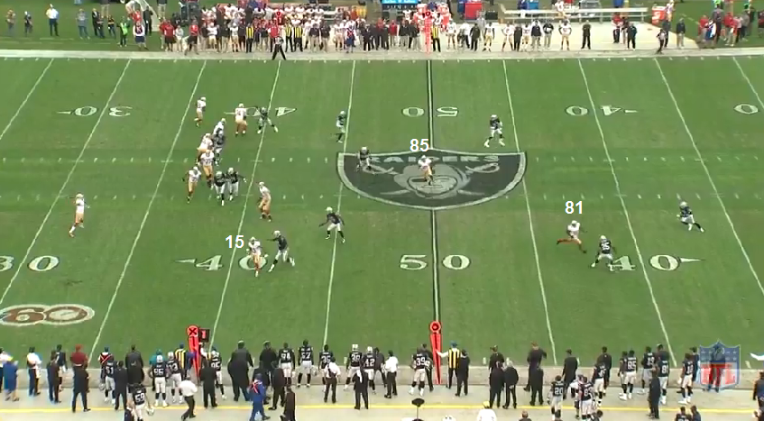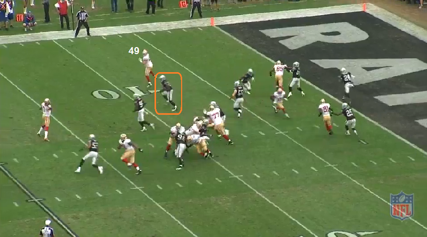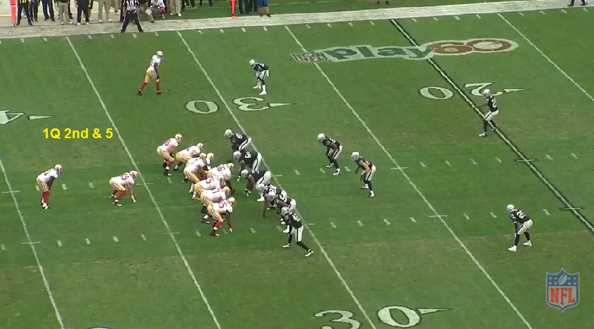 After the INT, the 49ers defense forced a 65 yard FG - the best of a bad situation. The 49ers got the ball back and would convert just 1 first down - punt. Then OAK punted. Then the 49ers would get their lone TD on the ensuing drive. This is how that drive started off, with their longest pass play of the day.