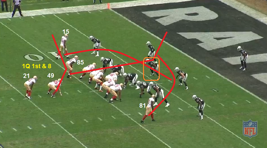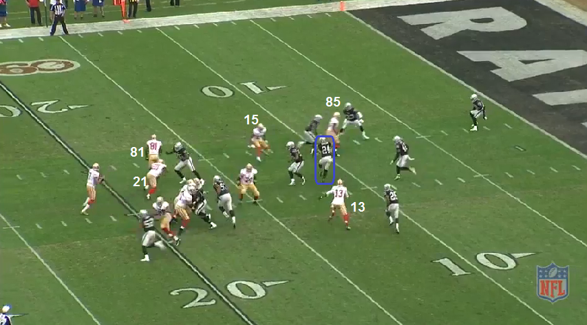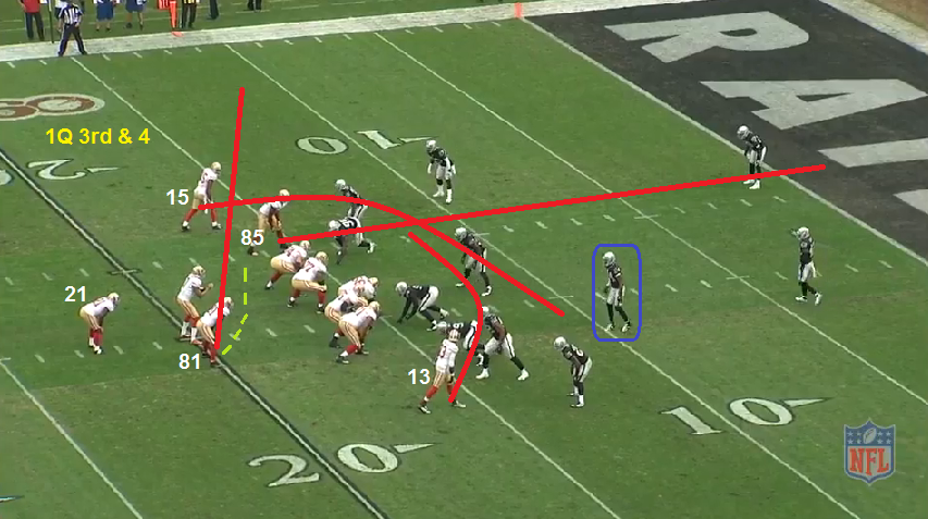 Crabs' route attracts the attention of the curl/flat defender on the playside (blue line connected to Crabs). Boldin clears the deep 1/3 DB. This earns room for VD. When the 49ers ran this same play last week, the SEA LB was alert to the play as he turned around and found VD. The OAK LB here (orange) does not do that. The correct throw is to VD.