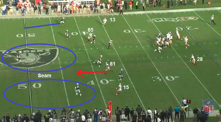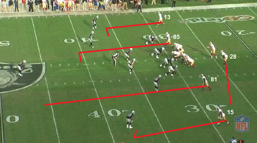 It looks like Oakland was focused on trying to take Boldin out of the passing game. You see the LB and Woodson close on Boldin's curl route. Oakland plays the concept side well. What CK needs to to here is move through this progression very quickly. You see the concept side is well covered - why? Because your two middle defenders are covering Boldin - that means the middle of the field will be open - you have an intermediate middle route on the backside.