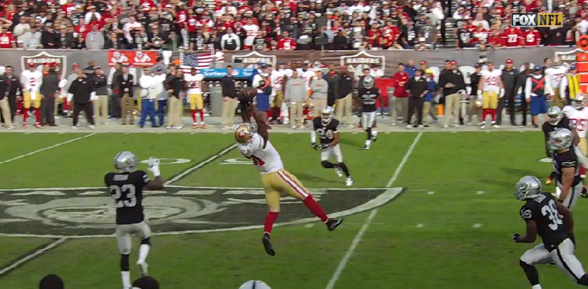 'From the endzone view you could see he was looking at VD's route - but he pulls down his throw - probably because it was coming a little late(I still think he could've gotten it in but I think he was scared of throwing another pick to the safety). He got to the right read, just too slow. He has to get through those reads faster. This is what Steve Young talked about when he said that these reads and knowing where to go on every play against every defense until it's reflexive. It's not reflexive yet, he's still digesting everything as it's happening and looking more at his receivers than the defenders.