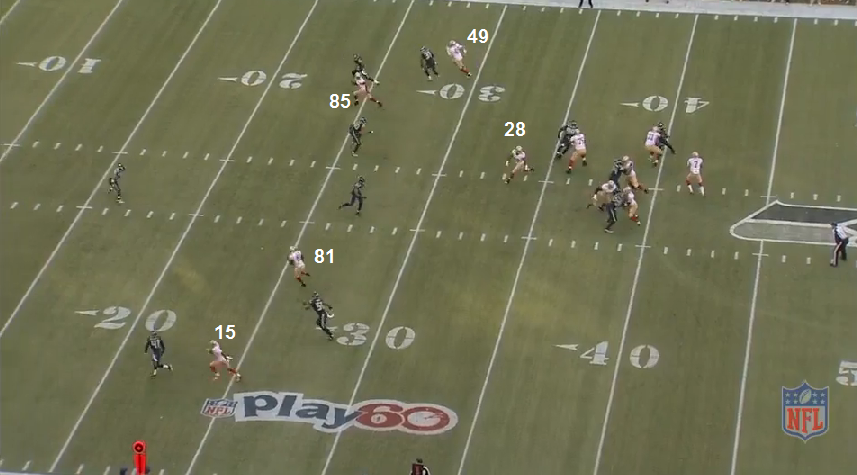 As Kap steps up in the pocket to buy time, orange is shaded towards VD and there is a vacant area behind him due to Ellington and VD's route. Kap stepping up also causes the hook/curl defender to step forward because he thinks Kap might scramble. This is more than enough time for Patton to work his away across the field which allows this route combination to completely develop. Kap starts looking towards Alonzo Smith's direction.