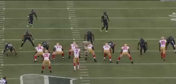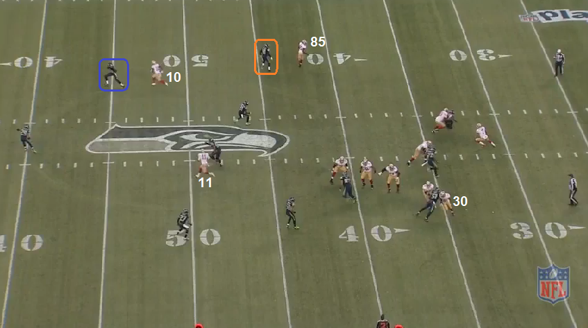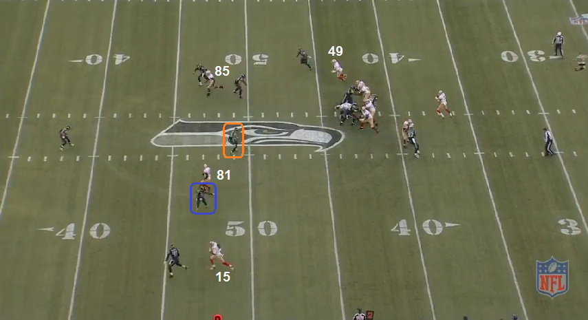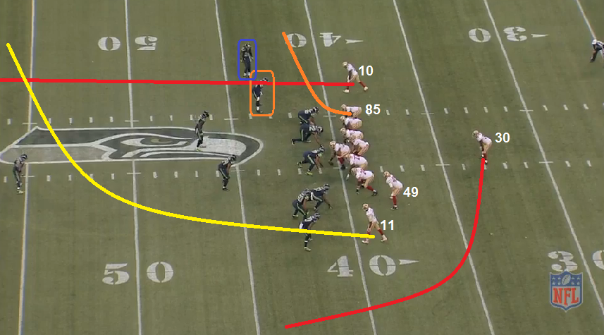 49ers: To Kap's right is the Sail concept (Ellington + Patton + VD). Ellingon's route is a clearing route to push the deep 1/3 defender (blue) back and out of the area they want to attack. The curl/flat defender (orange) is who the 49ers want to attack.