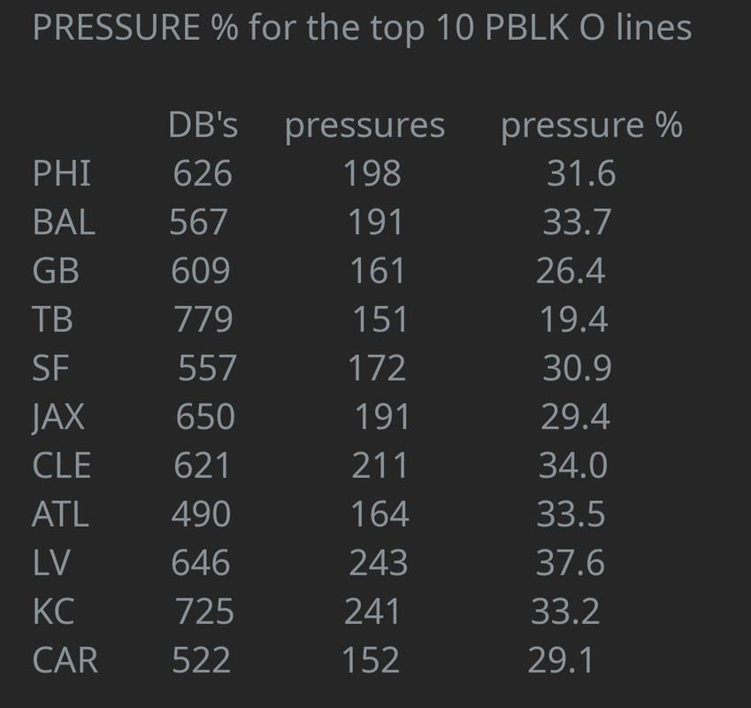 I can do another list based on pressure% if you all would like? But we have to stop basing our o line play on QB injuries as sacks do not equal injury. We also have to stop judging our o line based on the "eye test" unless of course you watch every snap of every offense every week during the NFL season. Otherwise you are judging them in a vacuum and not against their peers.