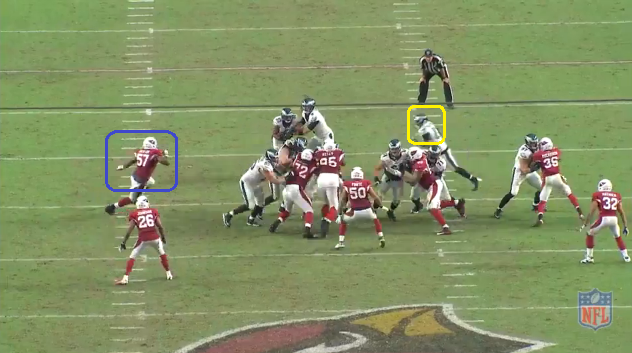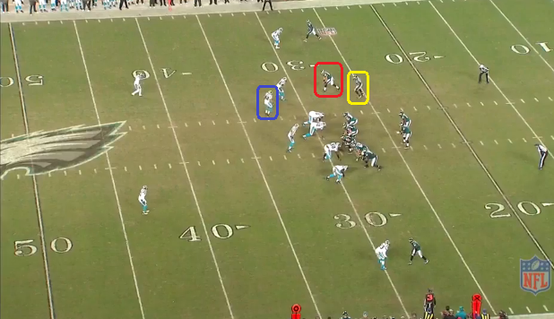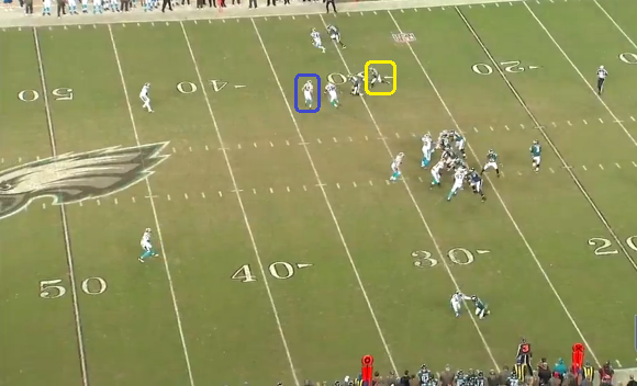 Both red and yellow stem to the outside maintaining their stacked look. In Cover2 Man, the slot CBs want to play with inside leverage to keep WRs away from the middle of the field, where the seam between the two safeties exist. You can see one defender with his hips turned to the outside, playing inside leverage. The blue CB is being picked via interference from his own team mate, and can't defend yellow.
