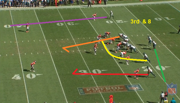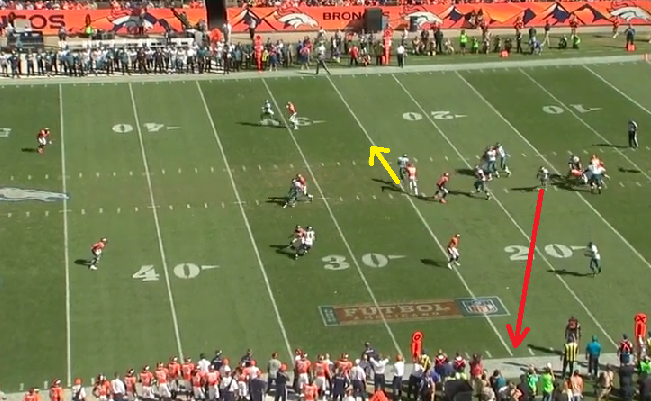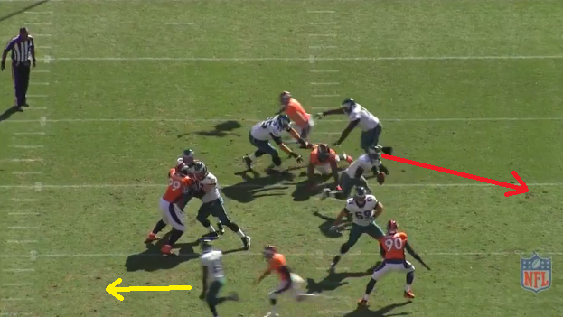 Vick tucks and runs. The yellow drag is there for the taking and room to run.
