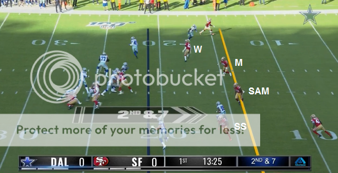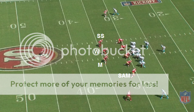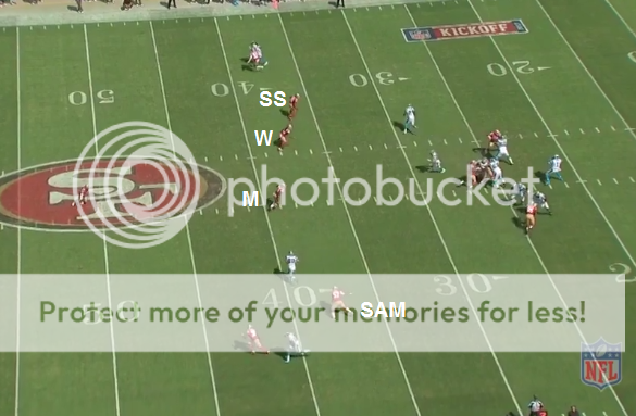 In this pic, the strongside DE looks like he's over the TE so I think this might be an Over front, although the WR aligned tight to the formation might be affecting how that DE lines up. The main point of this cutup is to show how the LBs are now all off the ball and how the zone assignments of the SAM/WILL/SS is different compared to when they ran 4-3 Under.