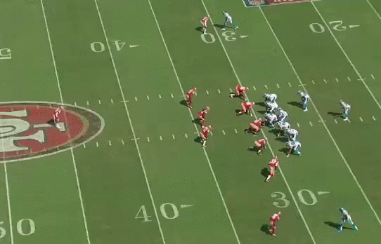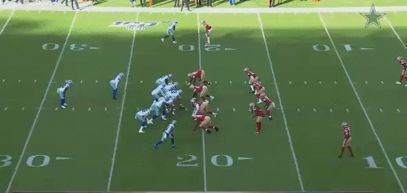 I didn't pay close attention to see if the 49ers were always in a wide9, but I can tell they are no longer a 5 man front like they used to be (small sample, one preseason game). I'm sure there will be times when the 49ers come with an Over front and it might look like wide 9 from the broadcast view, with the only way to tell is by looking at where the DE is lined up with respect to the TE. If the strong DE over the TE, it's most likely an Over front. If he's wide of the TE, then it could be wide9. Another sign is the NT and if he's playing 2i (wide9) or 1t (Over front), but that's hard to tell from broadcast.