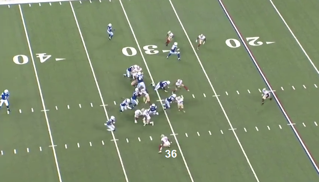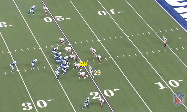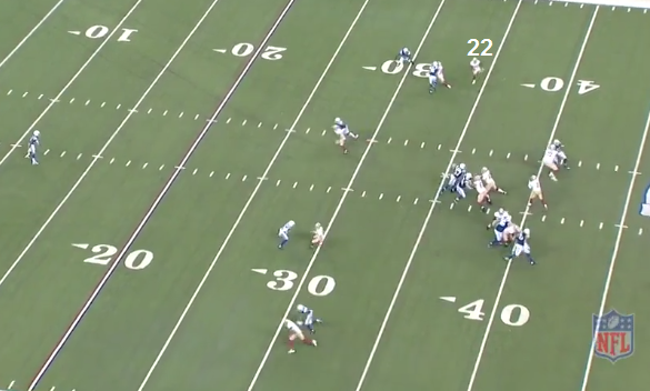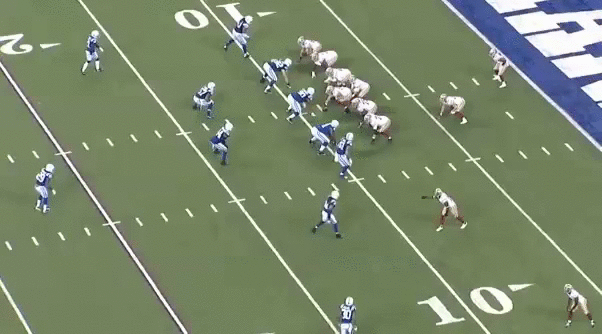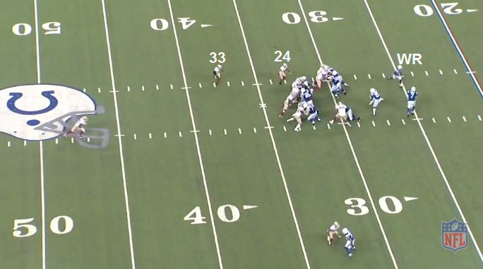 IND will pattern match the trips bunch. At the snap, Hyde steps to his right then quickly realizes that a LB is blitzing the B gap. Hyde will try to get back, but it's too late.