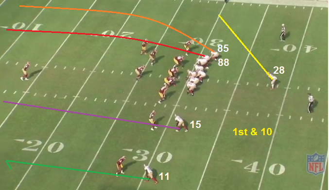 We run a lot of stuff here. We have a diagonal 7 concept, which is a variation of a smash or ohio concepts that uses a corner route or out route from the receiver at the top with a flat route and is used to beat 2 safeties. We then have a "drive" concept with Garcon and Taylor which will vertically stretch a cover 3 zone as it will put the weakside hook/curl defender in conflict.