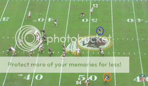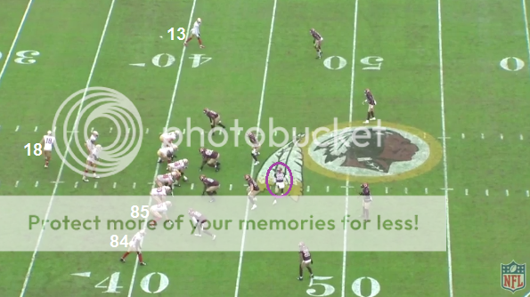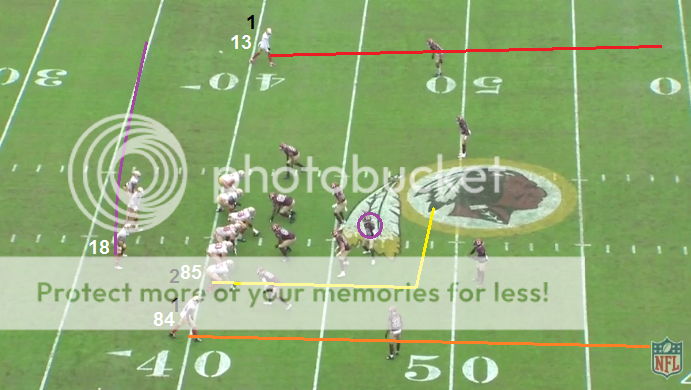 WAS makes a nice adjustment here on how to handle the motion from Pettis. Pettis' motion is supposed to draw the attention of the blue safety once Pettis becomes the new #2 at the snap, but it doesn't. It doesn't because WAS had purple follow the motion player so that the blue safety wouldn't be drawn away from his area.