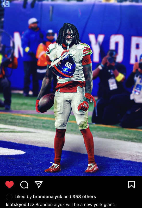 We'll be paying the man. Max Kellerman mentioned someone telling him Aiyuk would be the Giants biggest FA target and he laughed at the thought we'd ever let him go, especially since our QB situation allows us to keep him for a few more years.