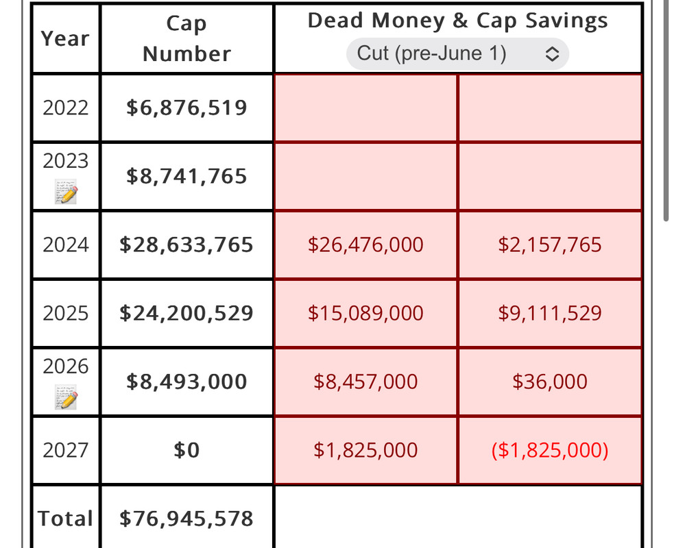 he has two "void" years that account for $120M, so if he was cut - they'd have $120M in dead cap just cause of that. Because they'll most likely restructure and/or extend - they'll just continue kicking the can down the road.