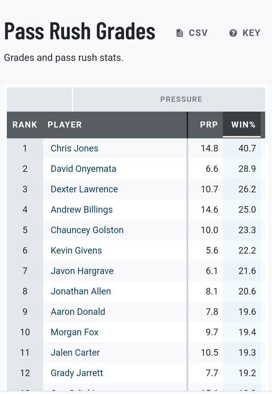 Interior pass rush win rate. We have the only defense with 2 interior DL in the top 10 in pass rush win rate so far.